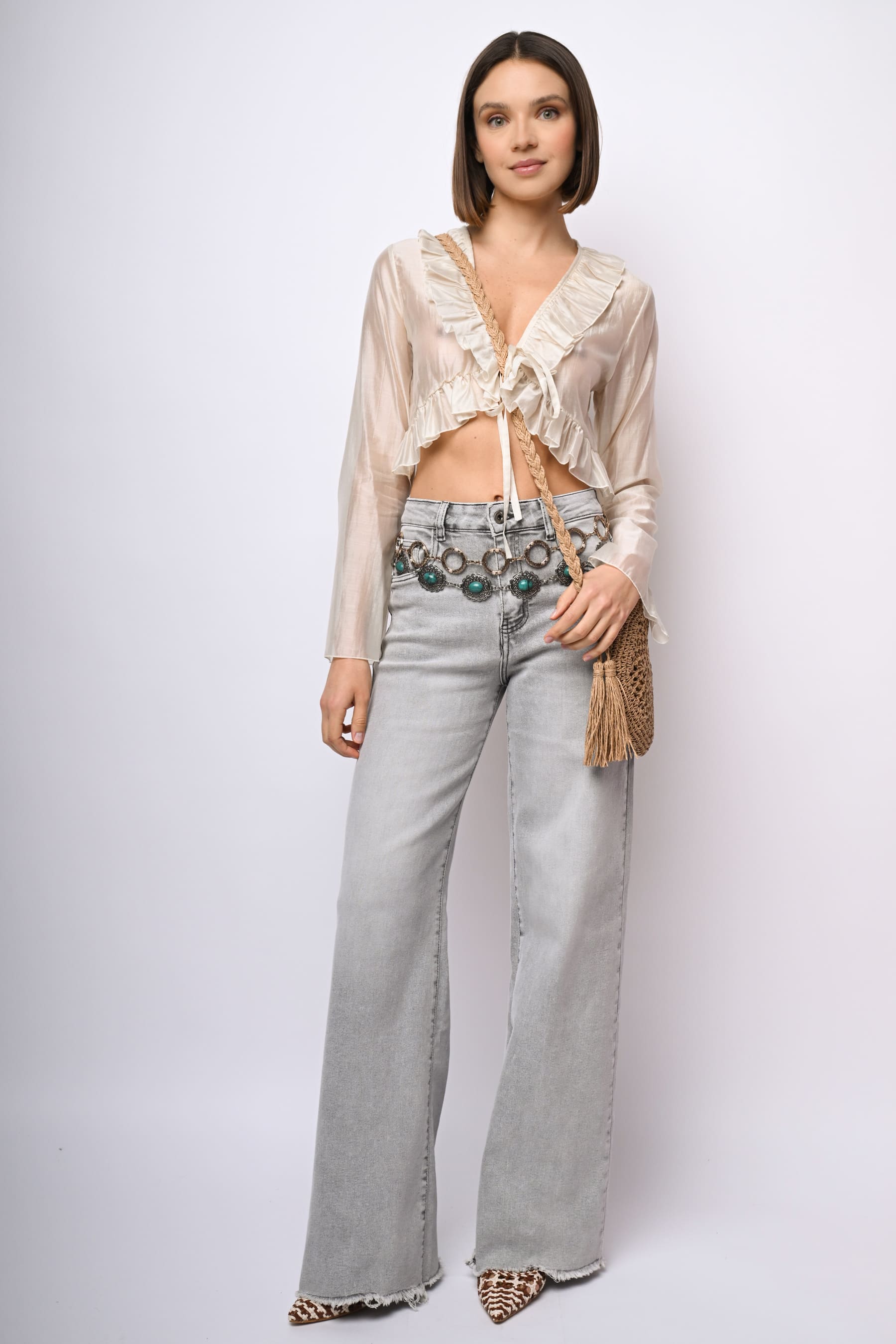 Jeans in denim stretch grigio chiaro con vita alta, passanti per cintura, chiusura con bottone e zip, taglio cinque tasche, gamba ampia e orlo sfrangiato.